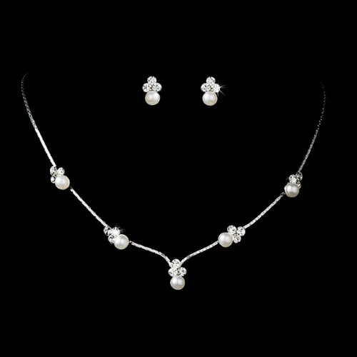 Bridal Wedding Jewelry Set Rhinestone Pearl Leaf White A striking necklace showcasing a silver setting and delicate leaf design laden with gorgeous white faux pearls and encrusted with clear crystals. Matching earrings complete the set. This beautiful set makes the perfect accessory for every special occasion. The necklace has a lobster claw closure. Earrings have post back closures for pierced ears. Matching bracelet is also available and sold separately.